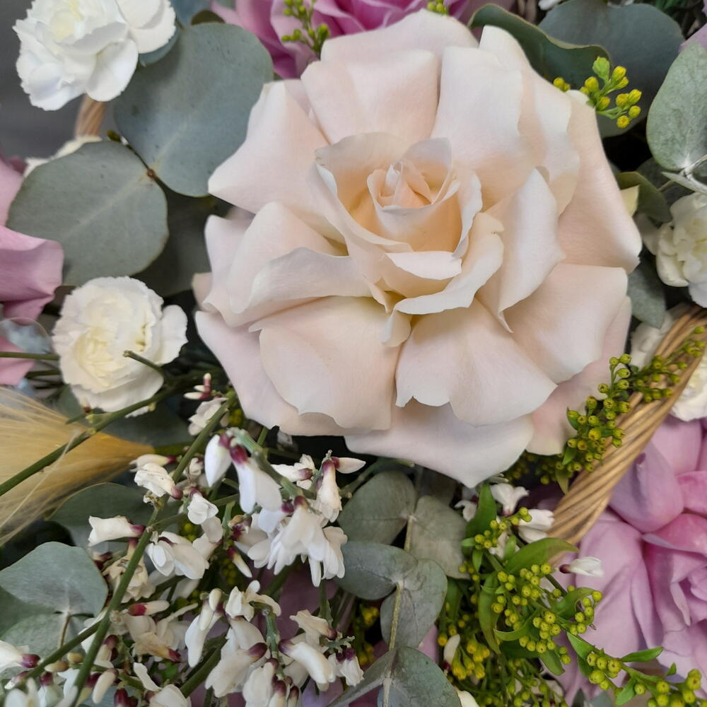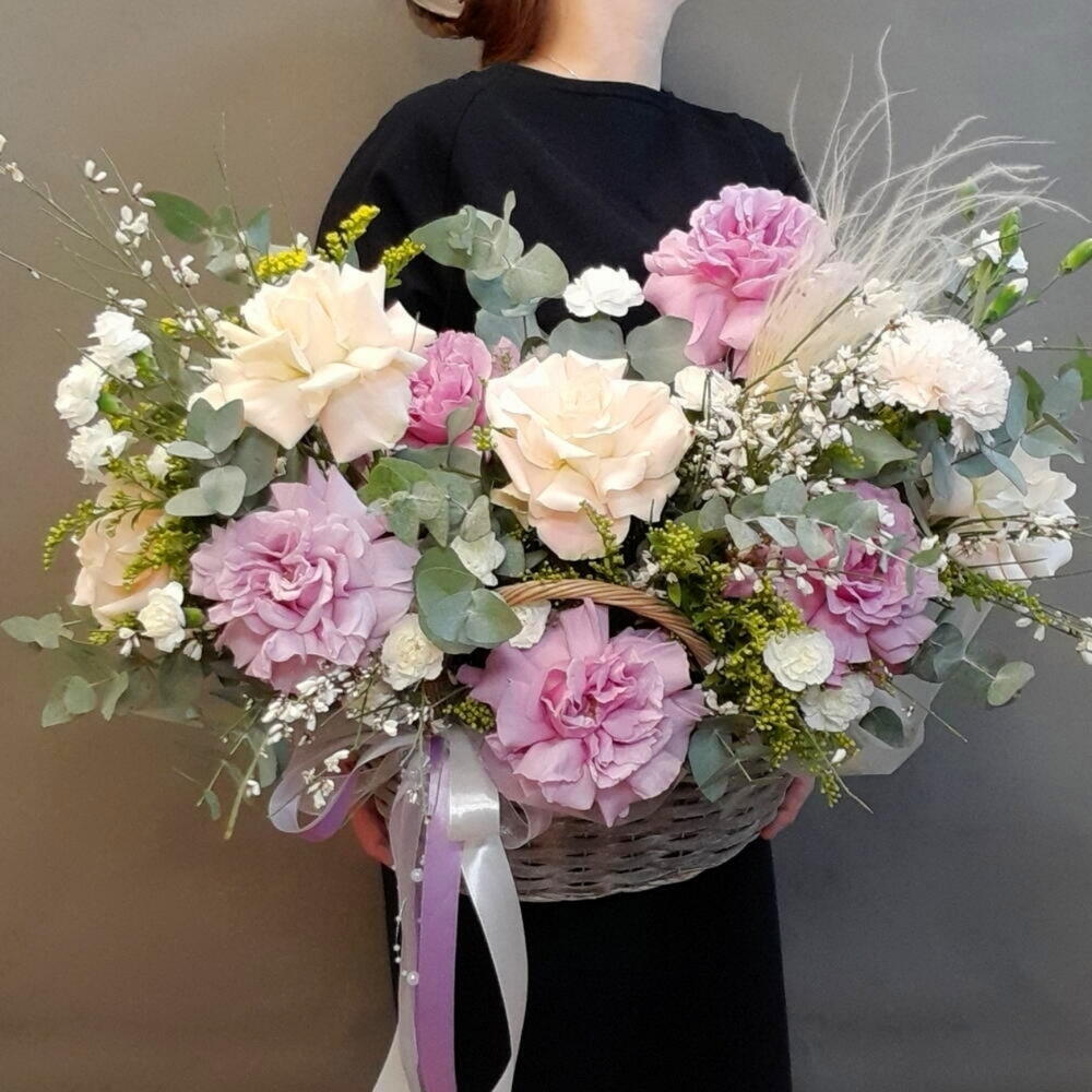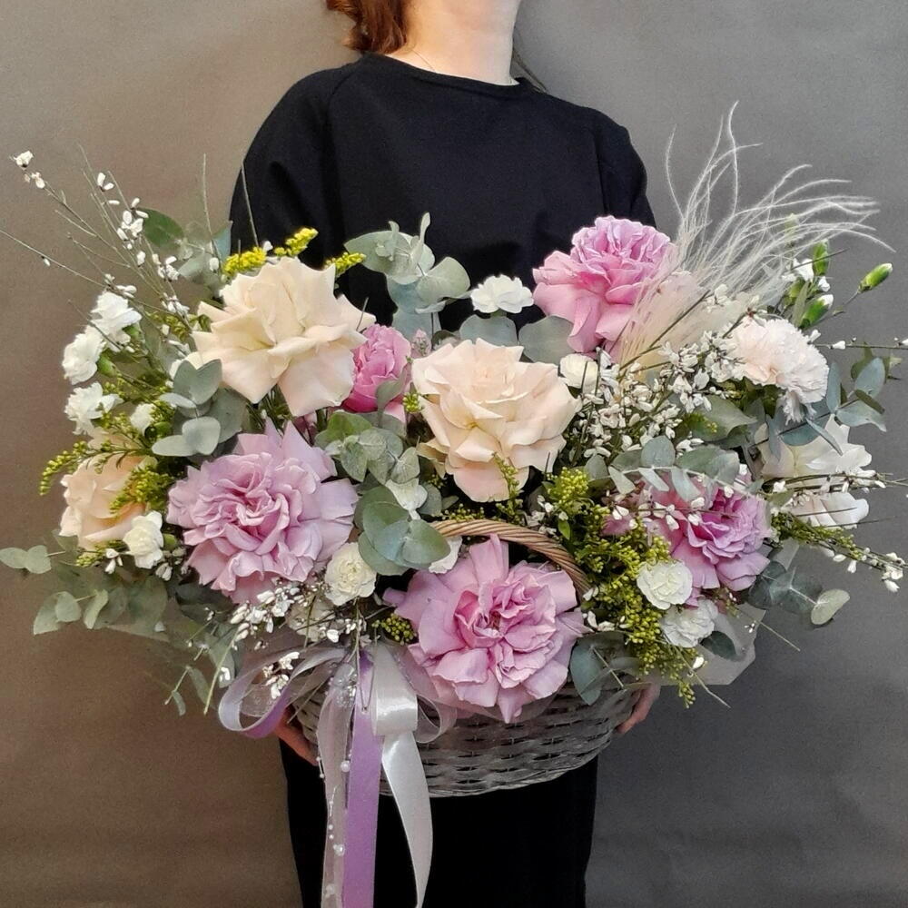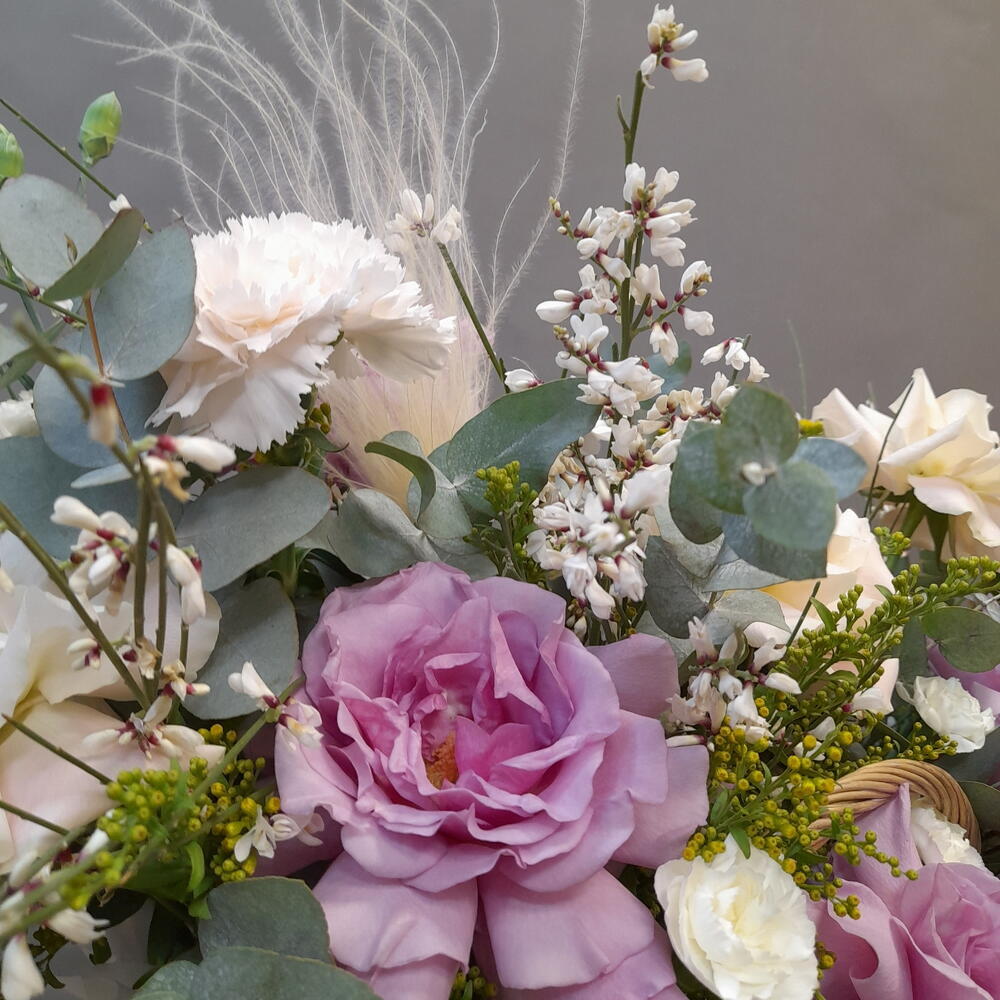 Состав: Солидаго - 9 шт. Корзина плетеная - 1 шт. Гениста - 4 шт. Роза французская - 4 шт. Диантус кустовой - 6 шт. Роза французская пионовидная - 5 шт. Оазис флористический - 1 шт. Эвкалипт - 10 шт. Диантус сортовой - 3 шт. ковыль пучок - 1 шт.