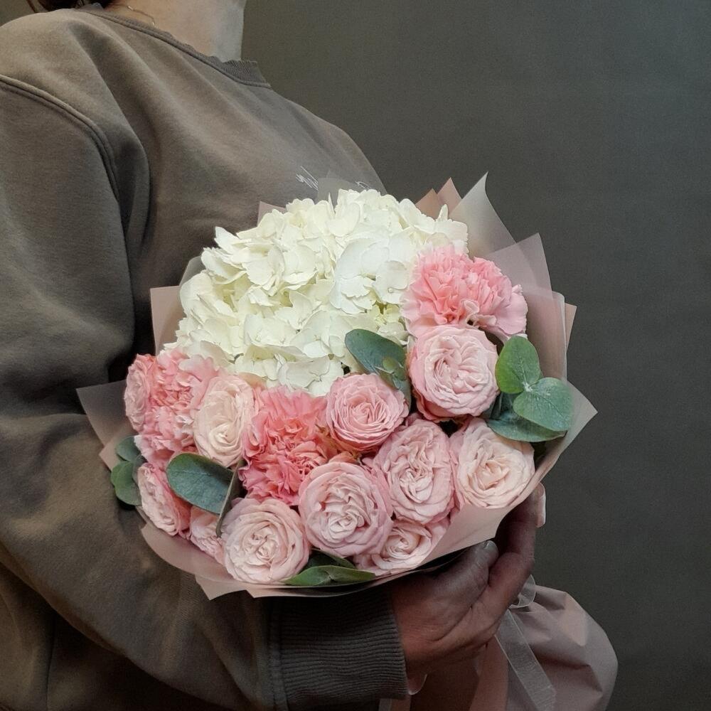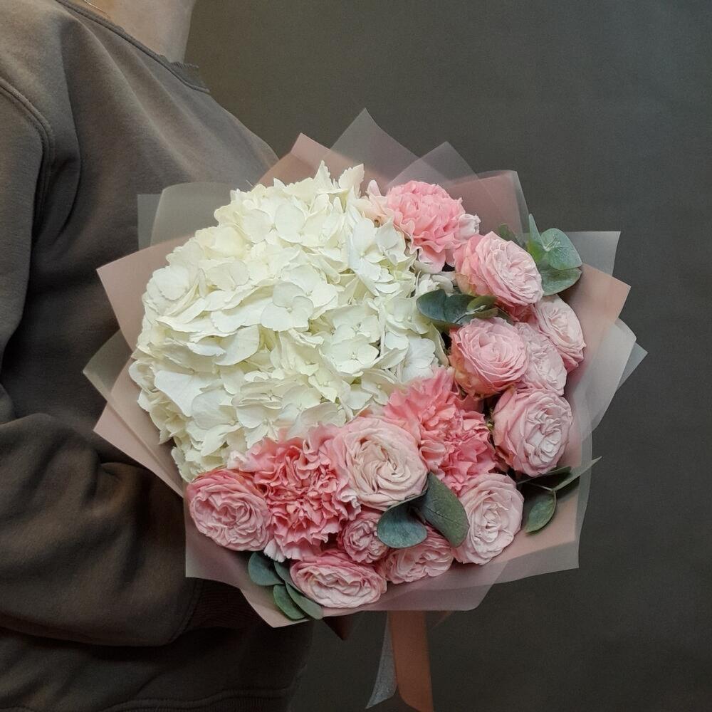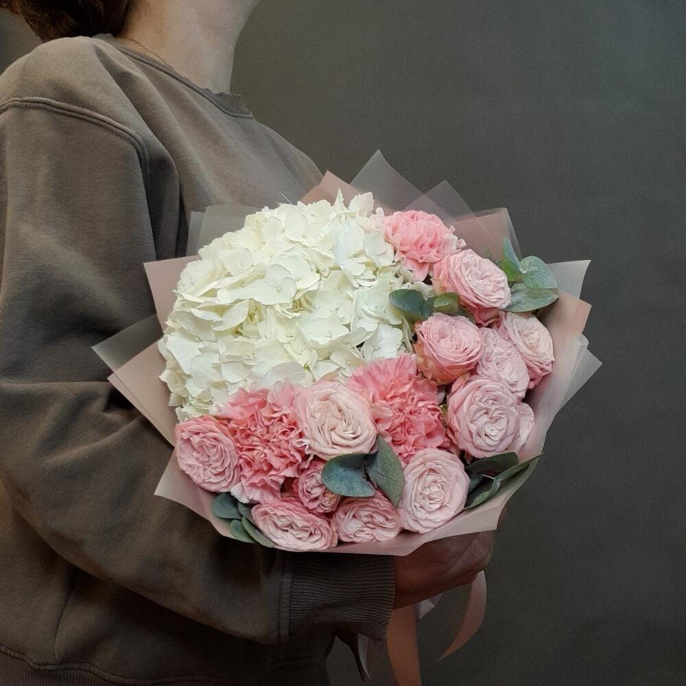 Сборный авторский букет из гортензии, пионовидных кустовых роз и гвоздики с эвкалиптом подойдет как в качестве презента на любой праздник - дня рождения, свадьбы и т.д., так и комплиментом коллеге, врачу, учителю, маме или подруге...