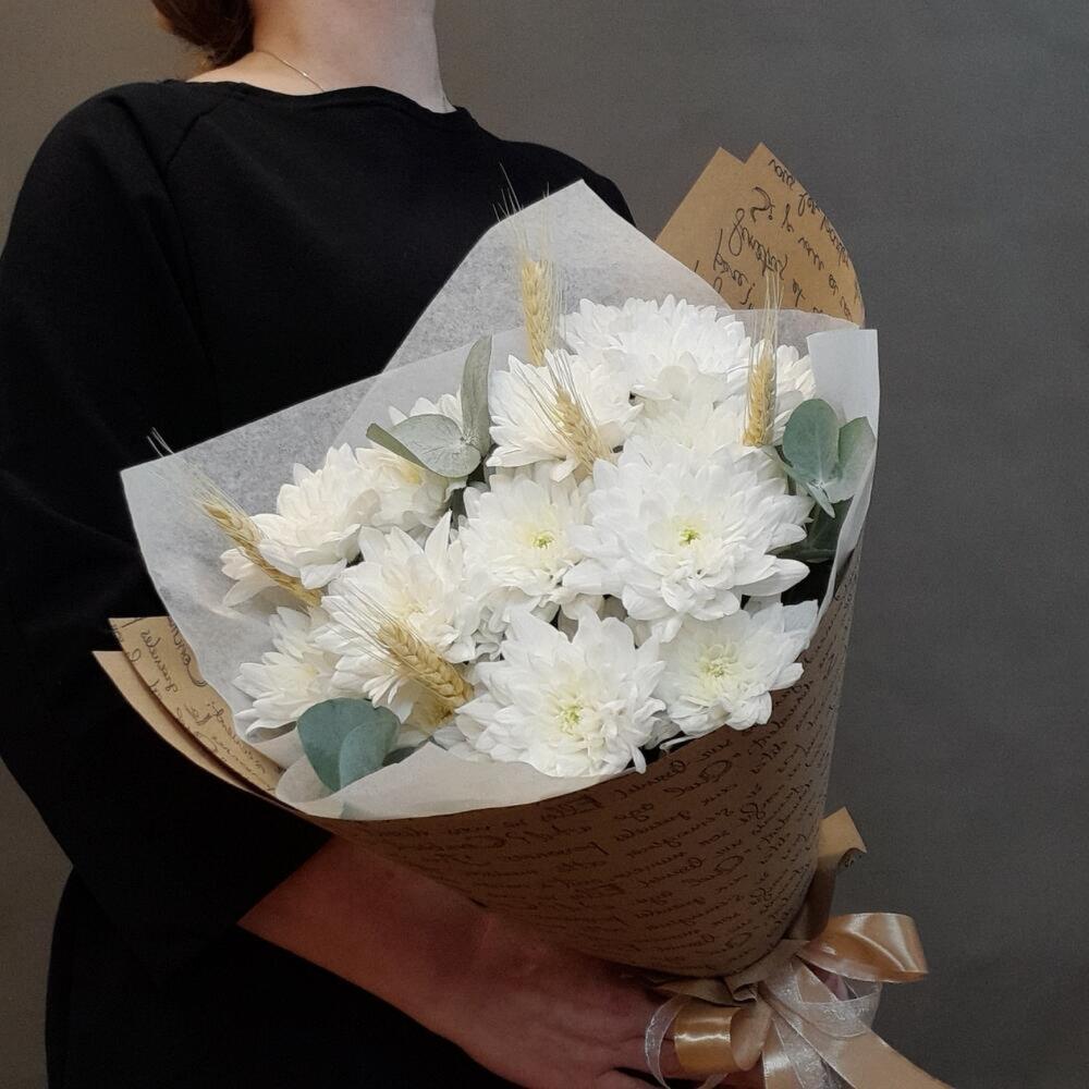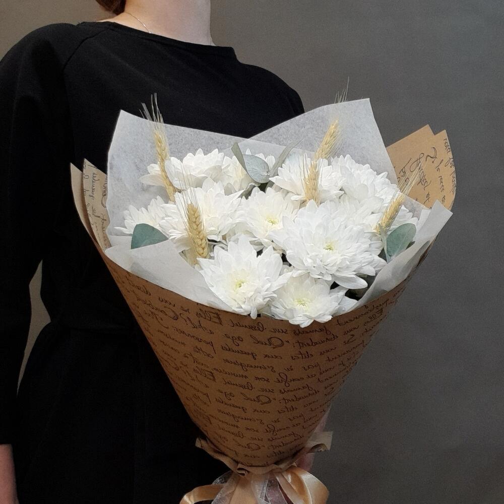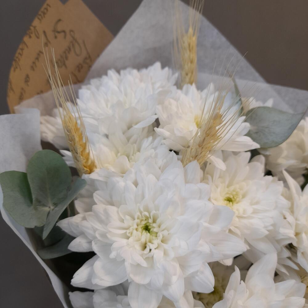 Состав: хризантема кустовая - 3 шт., эвкалипт - 3 шт., колосья - 5 шт., упаковка дизайнерская - 1 шт.