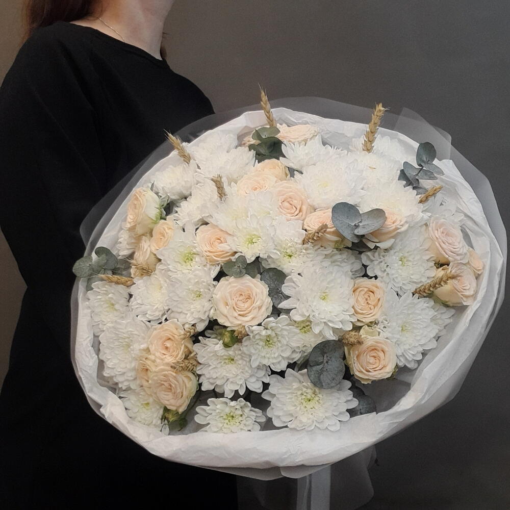 Большой букет собран из нежных кустовых роз и кустовых хризантем. Такой букет очаровывает своей нежностью, тонким ароматом и универсальной цветовой гаммой, которая нравится многим женщинам. Букет прекрасно подойдет для любого торжественного случая - свадьбы, юбилея, дня рождения и украсит интерьер дома.
