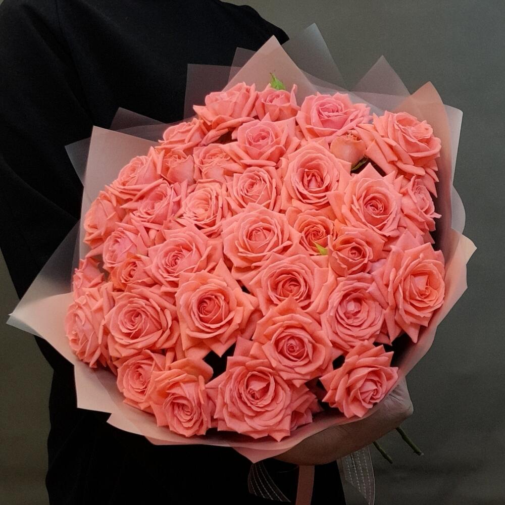 Кустовая роза кораллового оттенка с тонким, едва уловимым ароматом.