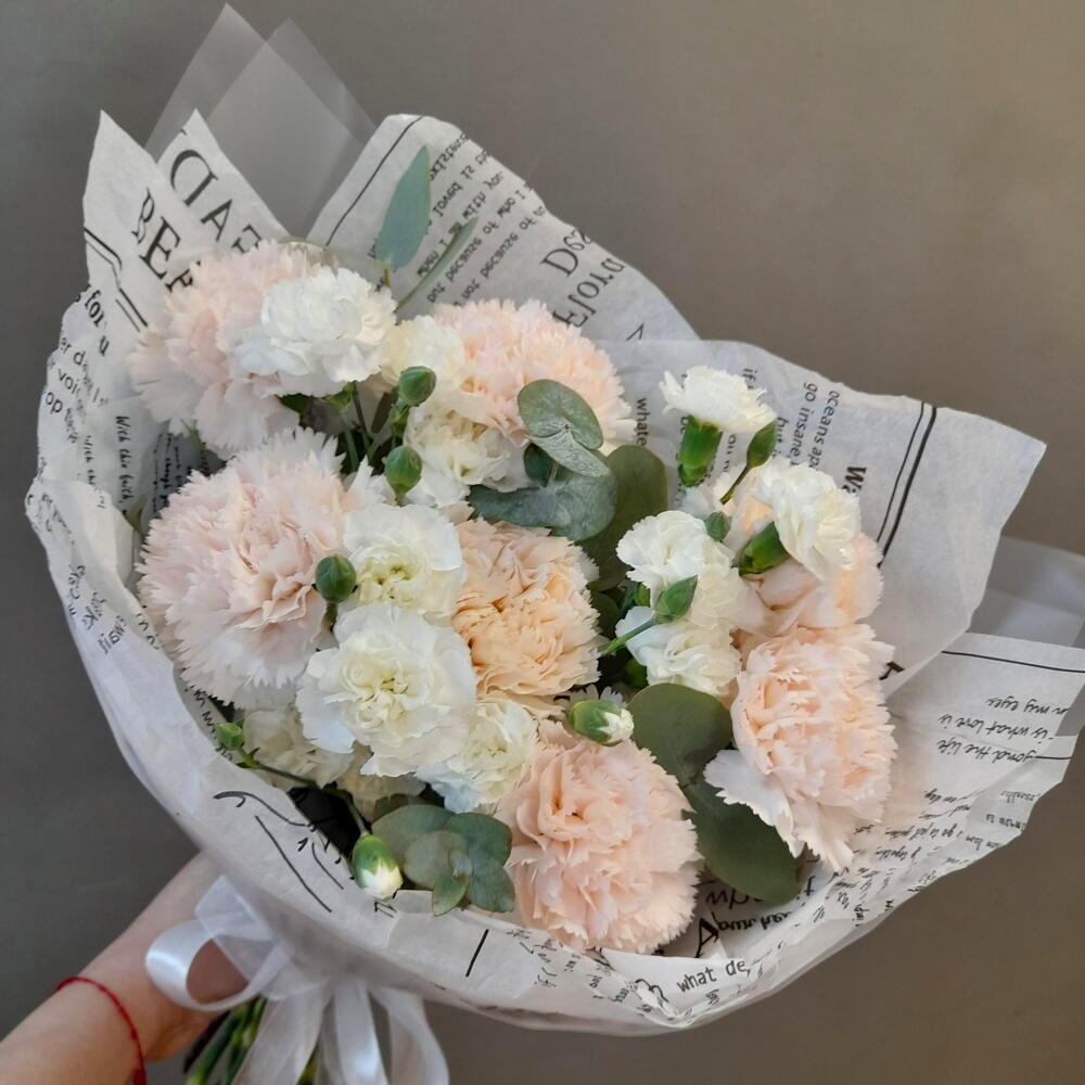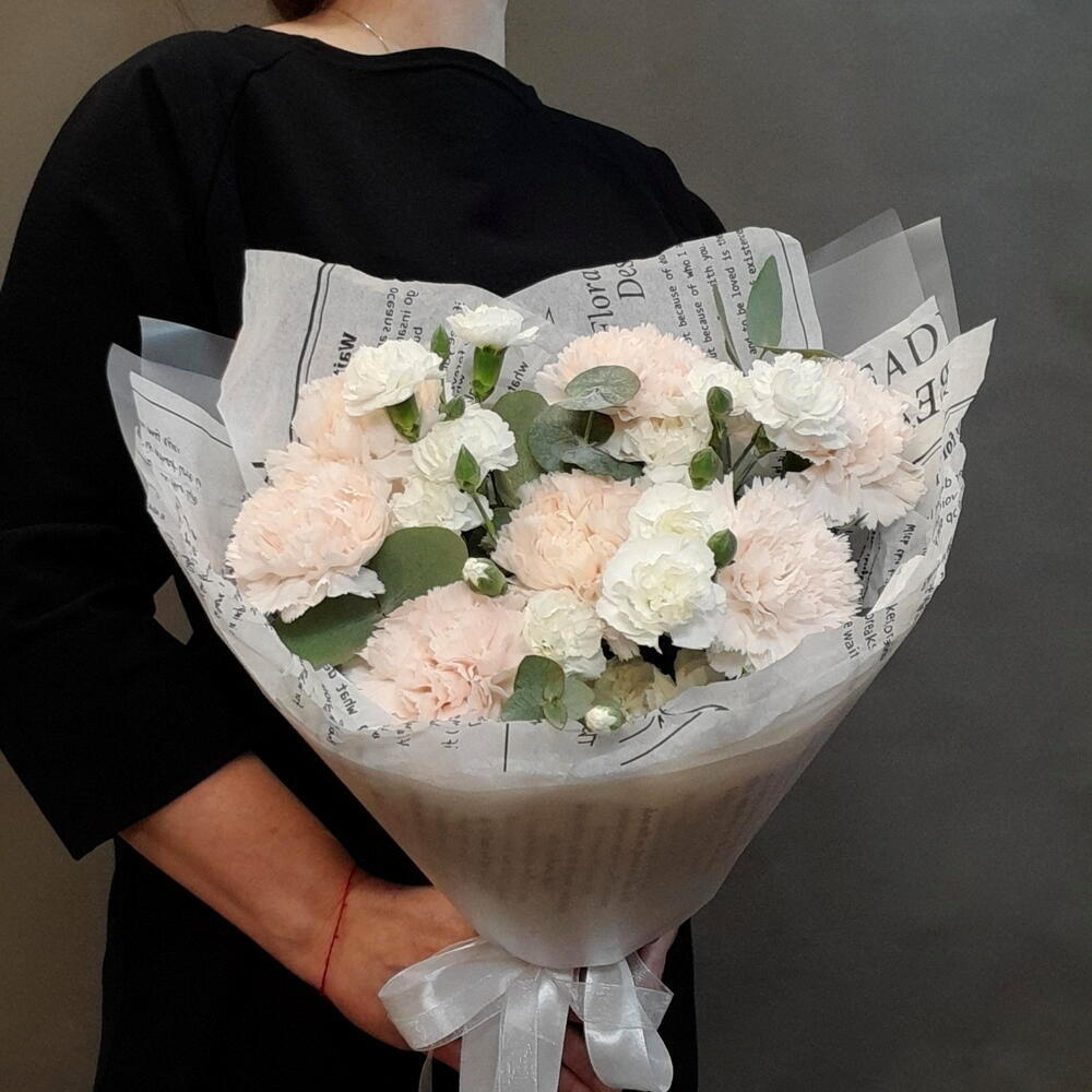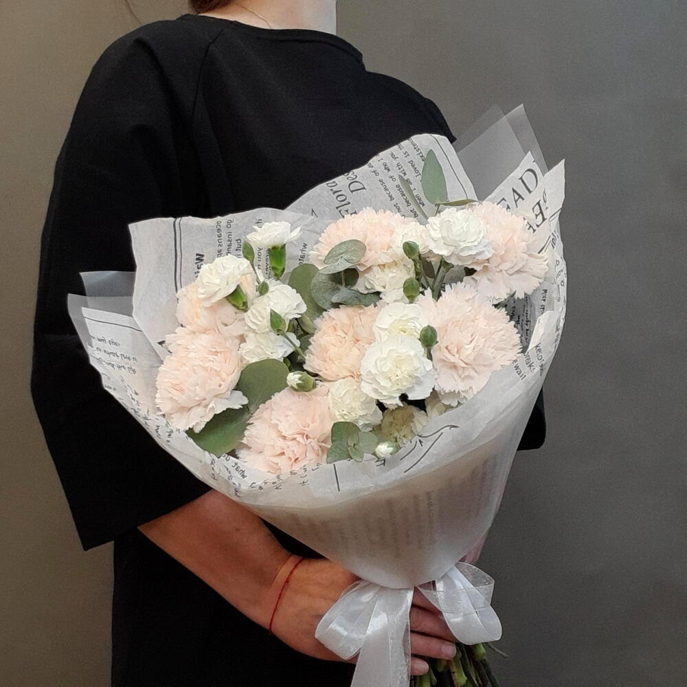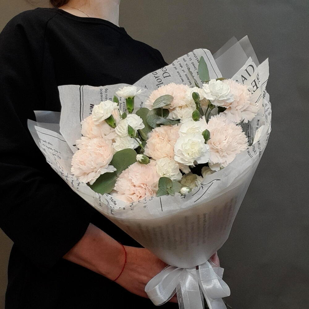 Нежный букет из кремовых гвоздик, в сочетании с белой ароматной кустовой гвоздикой, украсит любой интерьер и подойдет для любого случая - дня рождения коллеги, подруги, бизнес-партнера, мамы или бабушки, а также станет прекрасным подарком без повода. Гвоздика - стойкий цветок, он отлично переносит жару и прохладу, неприхотлив в уходе и очень симпатичен.