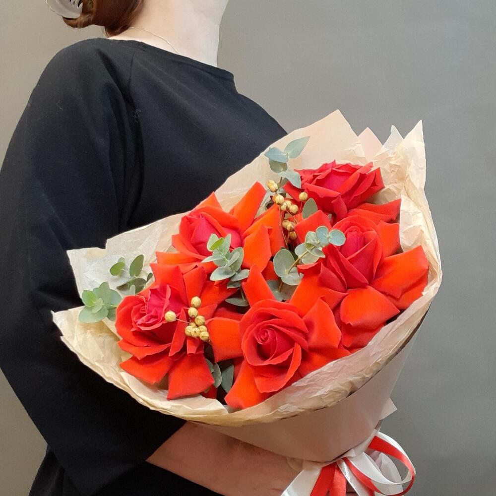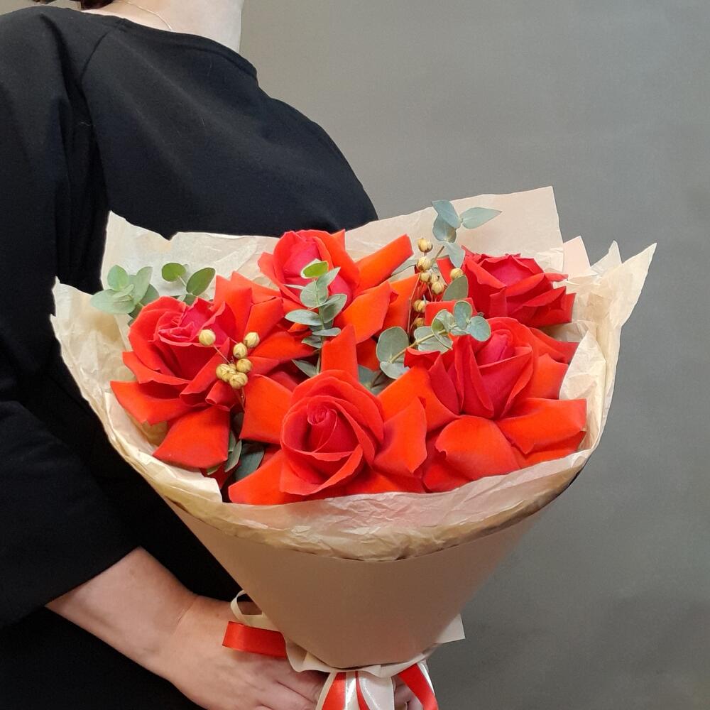 Букет из стойких, крупных, огненно-красных французских роз покоряют своей яркостью и необычным природным оттенком красного. Он украсит любой интерьер, подчеркнет важность события (дня рождения, свадьбы, повышения в должности или любой другой победы), оставит память о романтическом свидании или признании в любви. Спокойная, неброская упаковка кремового оттенка позволяет розе играть главную роль в букете и не конкурирует с ней.