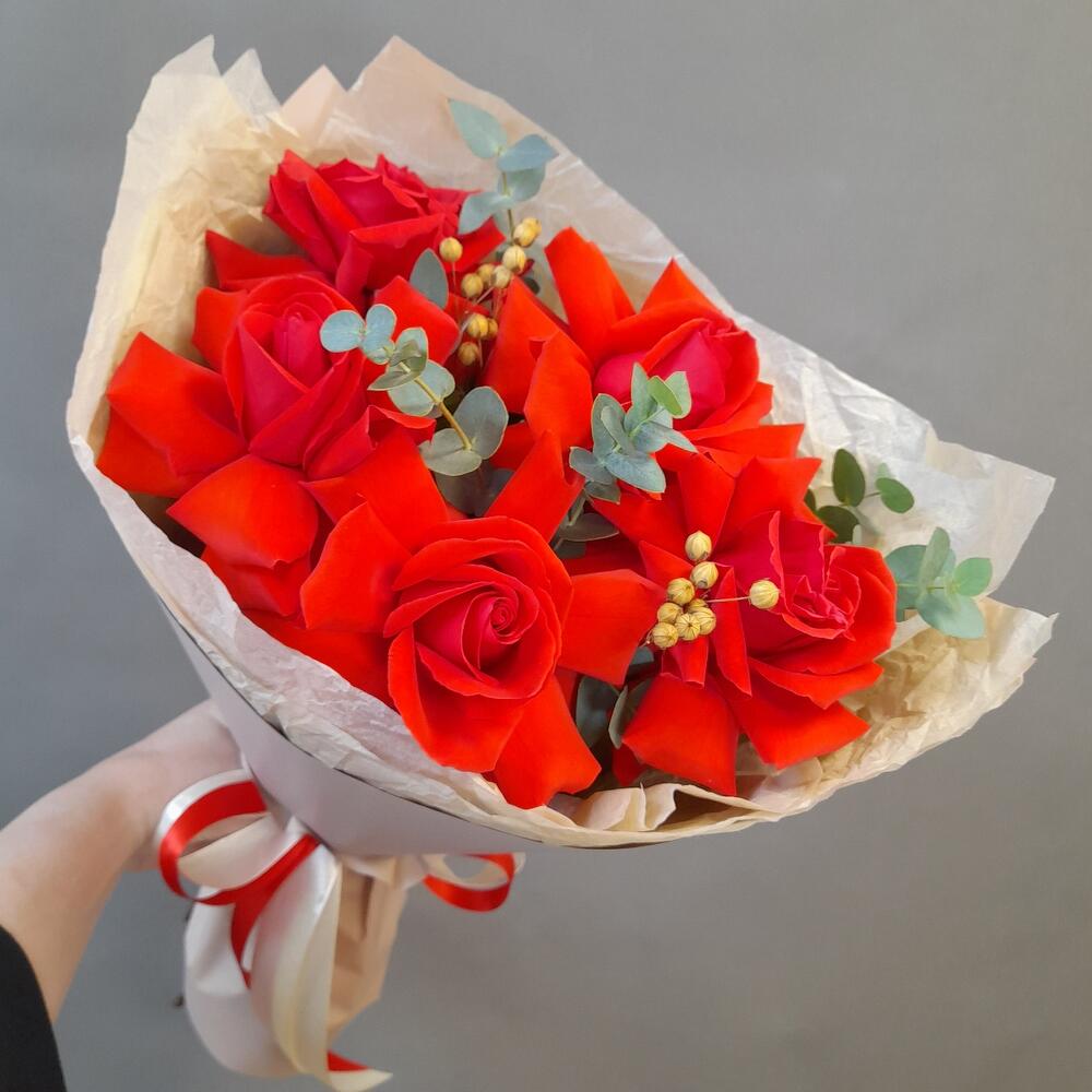 Состав: роза французская - 5 шт., эвкалипт - 2 шт., фисташка - 2 шт., лён - 2 шт., упаковка дизайнерская - 1 шт.
