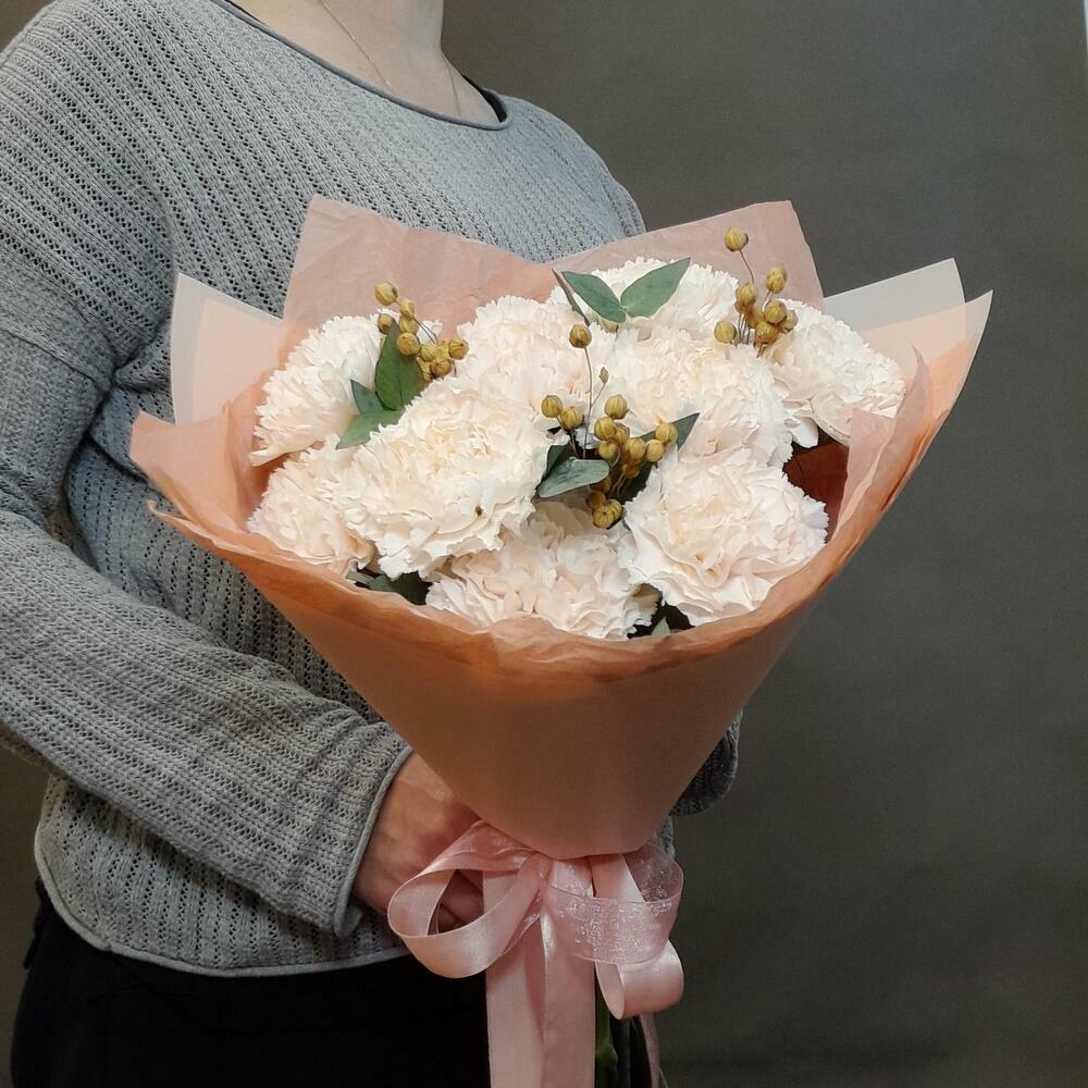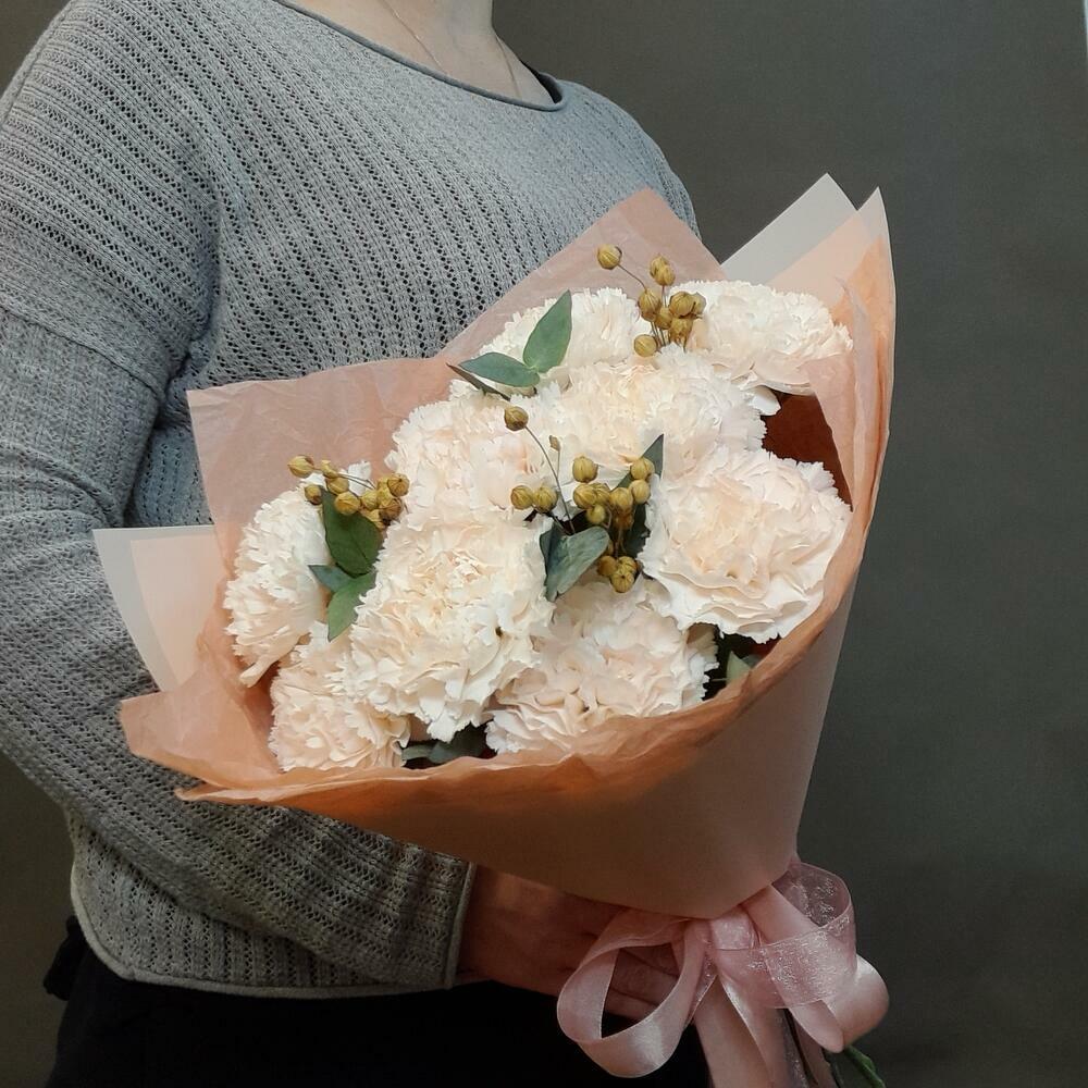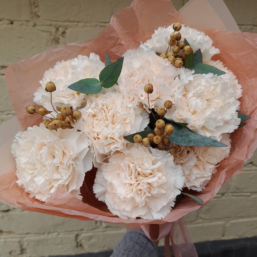 Букет из крупных, пушистых кремовых гвоздик с ароматным эвкалиптом и милыми акцентами из льна, станет достойным комплиментом для учителя, врача, коллеги, подруги, мамы и бабушки. Данный букет можно подарить не только в день рождения, но и в знак благодарности, внимания или просто без повода. Гвоздика - очень неприхотливый и стойкий цветок и, при должном уходе (информацию по уходу см. ниже), простоит в вазе довольно долго. Для того, чтобы продлить жизнь цветов в домашних условиях, подрежьте их под косым углом и поместите сразу же в вазу с холодной водой. Меняйте воду, как можно чаще, для предотвращения размножения бактерий. Также старайтесь не ставить вазу с цветами вблизи отопительных приборов и берегите их от сквозняков.