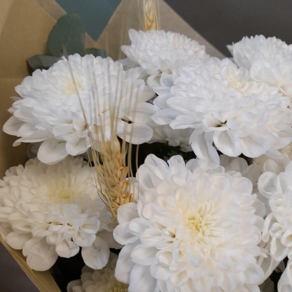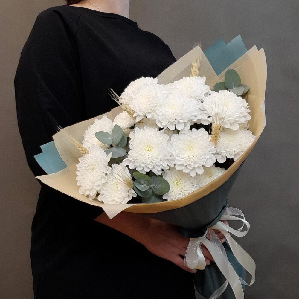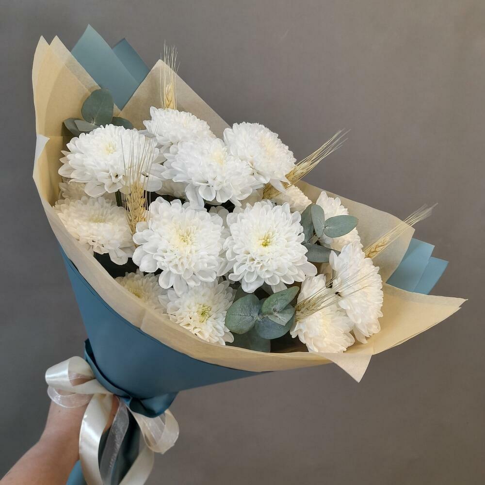 Состав: хризантема кустовая - 3 шт., эвкалипт - 3 шт., колосья - 5 шт., упаковка дизайнерская - 1 шт.