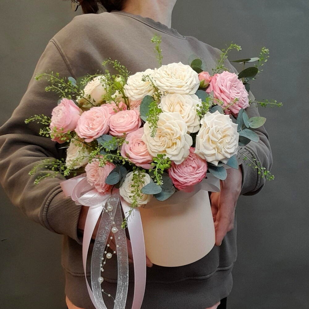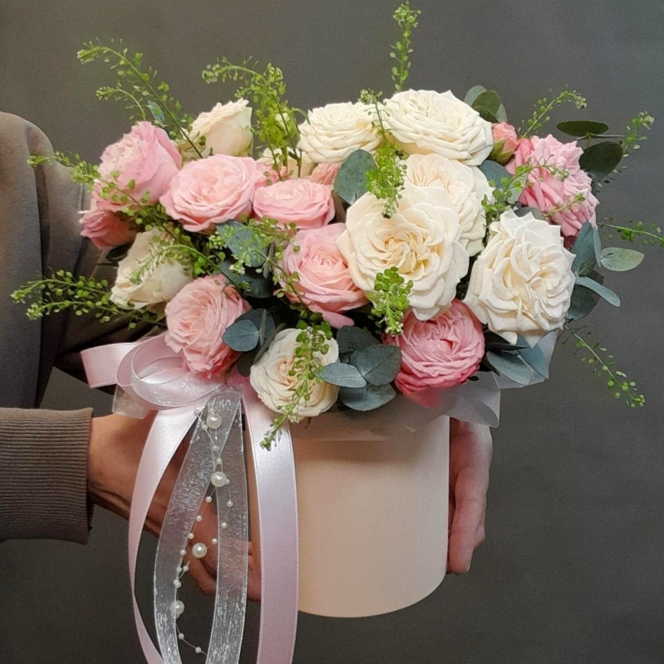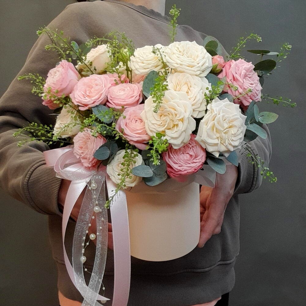 Состав: роза пионовидная кустовая - 7 шт., тласпи - 1 шт., эвкалипт - 1 шт., оазис флористический - 1 шт., коробка шляпная - 1 шт.