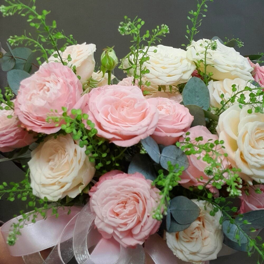 Милая композиция, из пионовидных кустовых роз двух оттенков, с акцентами из ароматного тласпи и эвкалиптом, очаровывает своими нежными оттенками. Такая композиция подойдет для любого случая - дня рождения, свадьбы, 8 марта, любого другого радостного и светлого события.