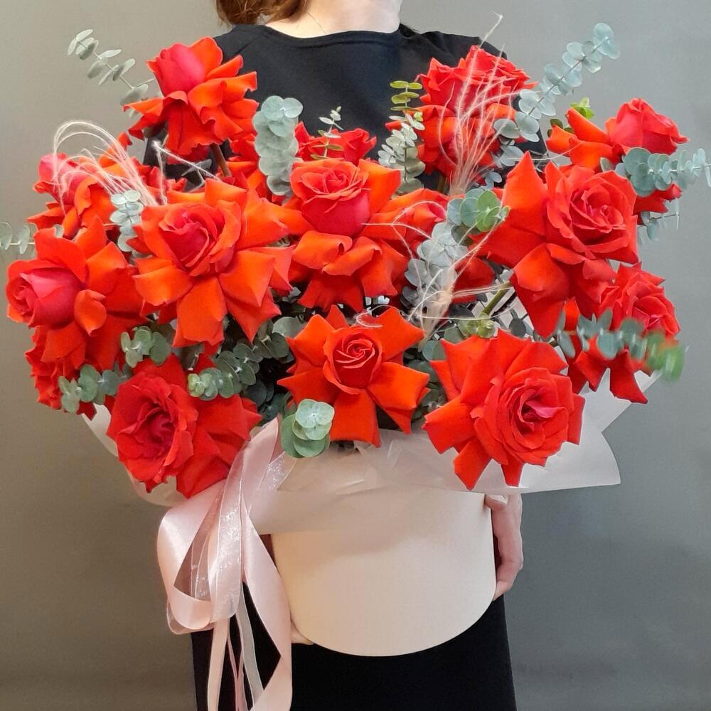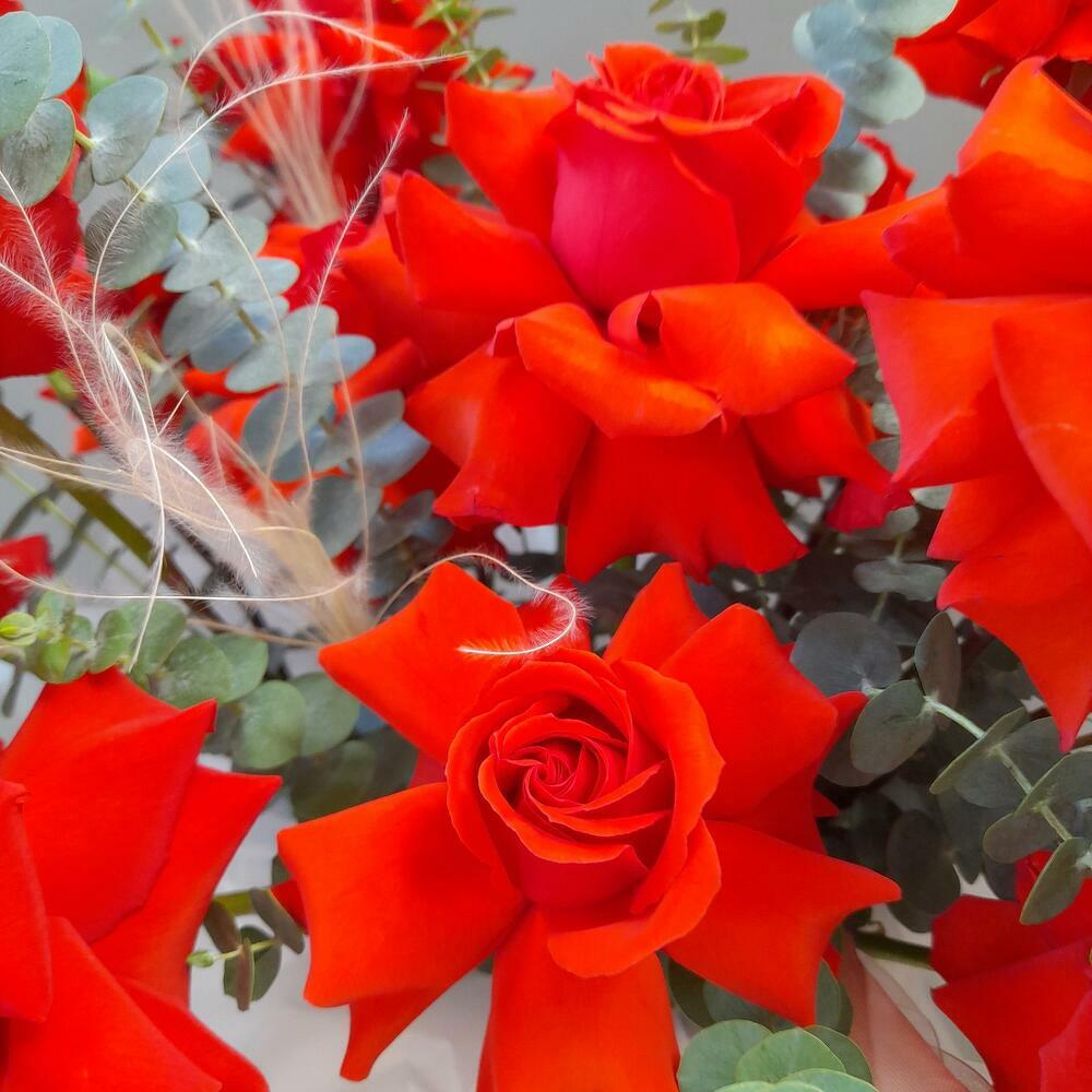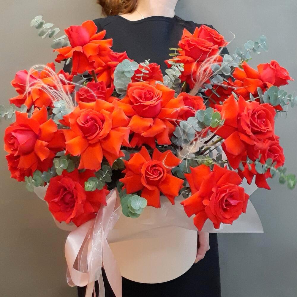 Композиция из французских алых роз с эвкалиптом. Роскошные, крупные, яркие и стойкие бутоны французских роз создают праздничную атмосферу композиции. Они украсят любой интерьер и подойдут для торжественных случаев - дня рождения, юбилея, свадьбы, рождения ребенка, признания в любви и предложения руки и сердца.