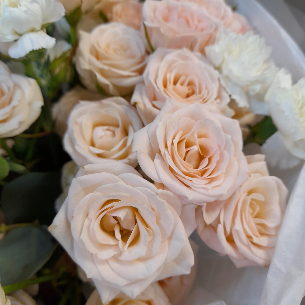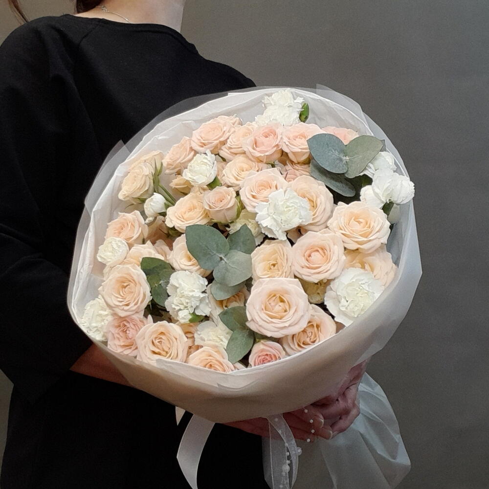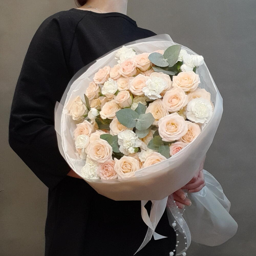 Букет собран из великолепного цветочного ансамбля - кремовых кустовых роз, ароматной белой кустовой гвоздики и эвкалипта. Нежная упаковка с нитью жемчужной ленты, в качестве акцента, создает воздушность букету.